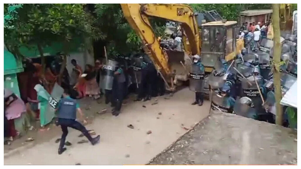 সংঘর্ষের সময় ক্ষুব্ধ জনতা একটি বুলডোজার ভাঙচুর করে। এ ঘটনায় বুলডোজার চালকসহ কয়েকজন গুরুতর আহত হন। স্থানীয়দের অভিযোগ, কোনো নোটিশ ছাড়াই হঠাৎ পুলিশ এসে তাদের ওপর হামলা চালিয়েছে। পুলিশের দাবি, তারা কেবল উচ্ছেদ অভিযানে সহযোগিতা করছিলেন।
