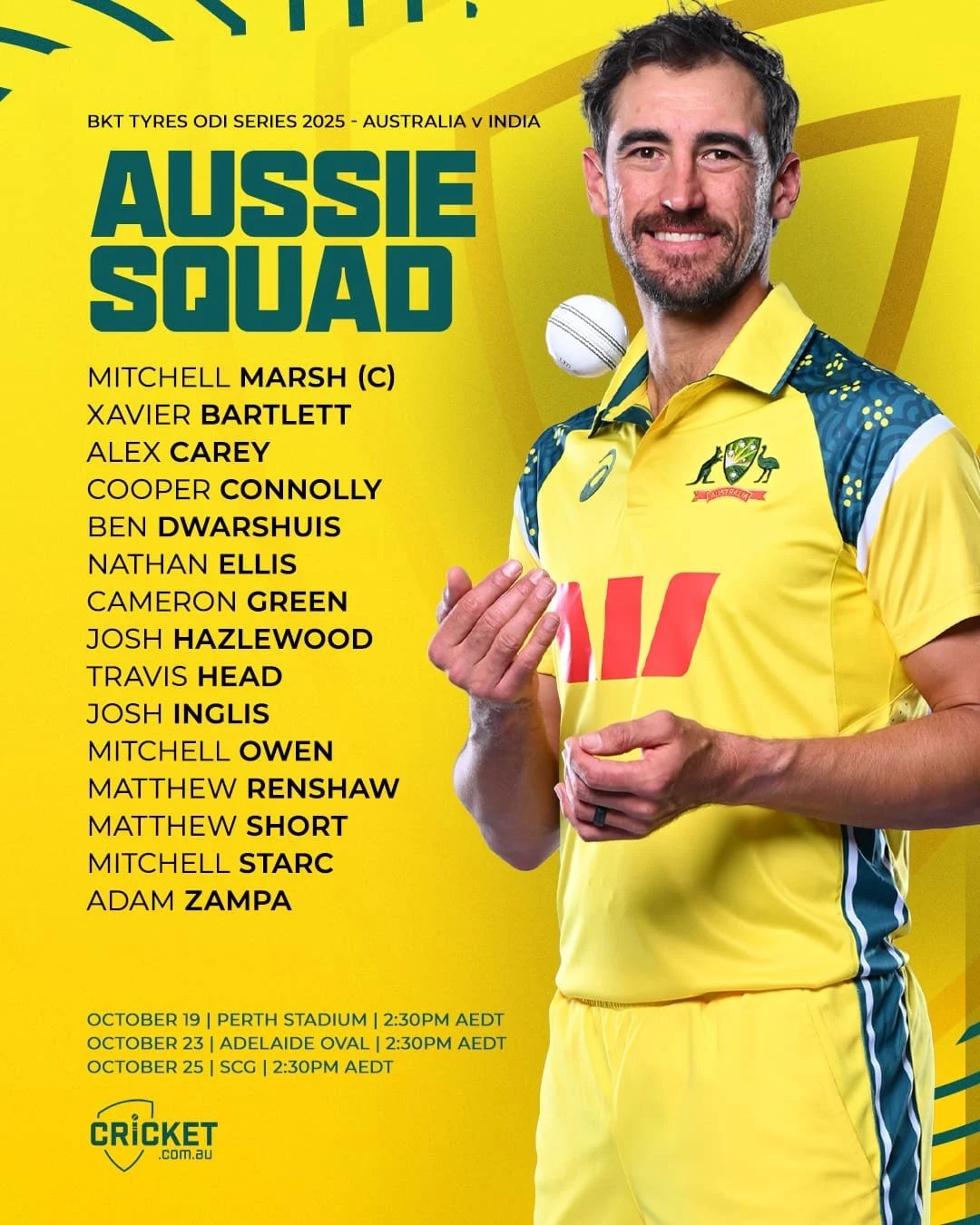 ওয়ানডে সিরিজের জন্য ১৫ সদস্যের এবং টি-টোয়েন্টির জন্য ১৪ সদস্যের দল দিয়েছে সিএ। দুই দলকেই নেতৃত্ব দেবেন মিচেল মার্শ। অভিজ্ঞ লাবুশেনের পরিবর্তে প্রথমবারের মতো ওয়ানডে দলে ডাক পেয়েছেন তার কুইন্সল্যান্ড সতীর্থ ম্যাট রেনশো।