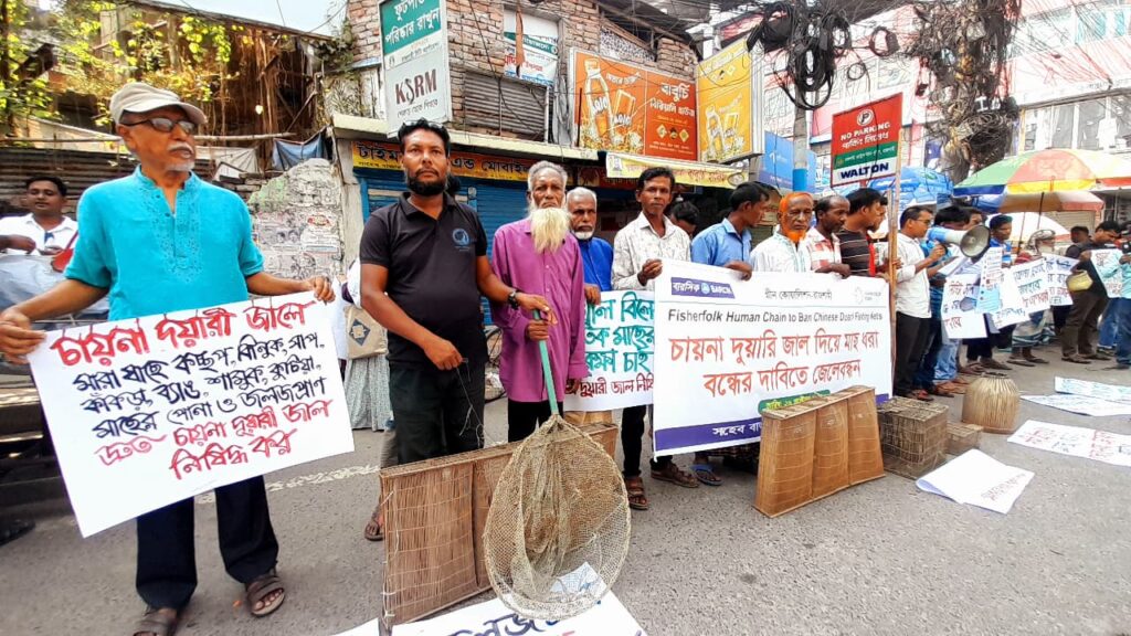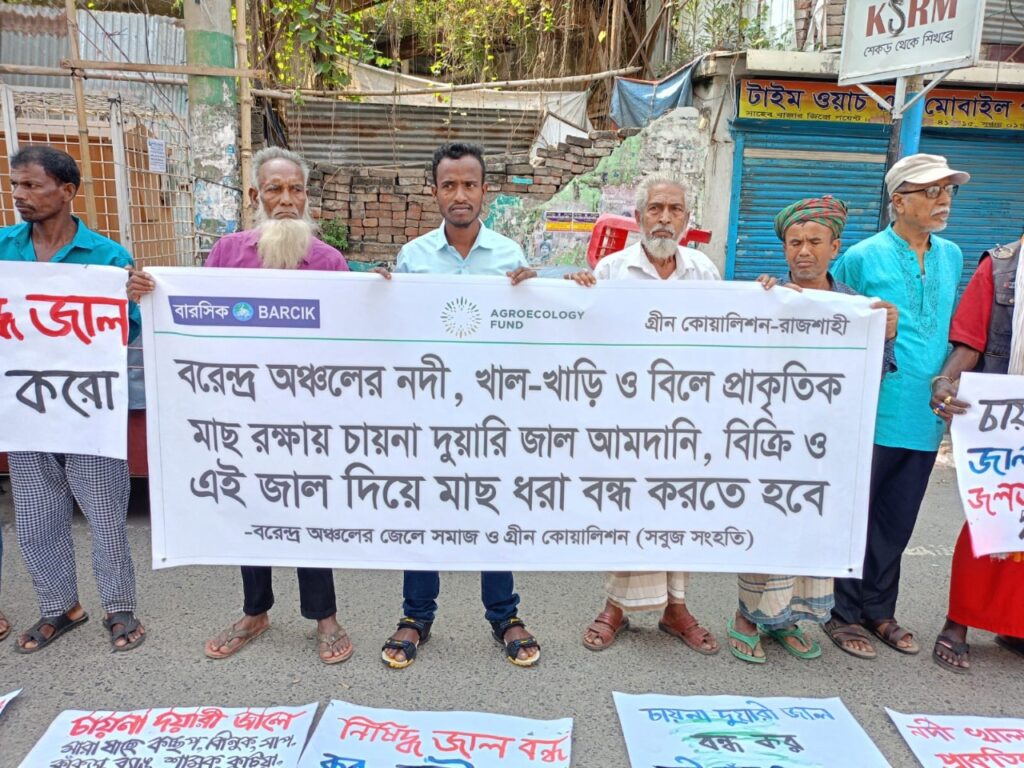 জলাভূমি, দেশীয় মাছ ও জীববৈচিত্র্য রক্ষায় চায়না দুয়ারি জালসহ সব ধরনের বিদেশি ক্ষতিকর মাছ ধরার সরঞ্জাম নিষিদ্ধের দাবিতে রাজশাহীতে মানববন্ধন করেছে স্থানীয় জেলে সম্প্রদায়। একই সঙ্গে এসব জাল আমদানি, বিক্রি ও ব্যবহার বন্ধে মৎস্য ও প্রাণিসম্পদ মন্ত্রণালয়ের উপদেষ্টার কাছে স্মারকলিপিও দিয়েছে তারা।