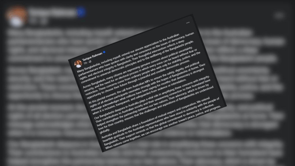 বাংলাদেশের ত্রয়োদশ জাতীয় সংসদ নির্বাচন সামনে রেখে প্রার্থীদের নিরাপত্তা নিয়ে উদ্বেগ প্রকাশ করেছেন অস্ট্রেলিয়ার কয়েকজন সংসদ সদস্য। তারা বিএনপির ভারপ্রাপ্ত চেয়ারম্যান তারেক রহমানসহ সব প্রার্থীর নিরাপত্তা নিশ্চিতে আহ্বান জানিয়েছেন। এ অবস্থায় অস্ট্রেলিয়ান এমপিদের এমন সমর্থনের জন্য কৃতজ্ঞতা জানিয়েছেন তারেক রহমান। শনিবার (১৫ নভেম্বর) নিজের ভেরিফায়েড ফেসবুক পেজে প্রকাশিত এক পোস্টে তিনি এই কৃতজ্ঞতা প্রকাশ করেন।