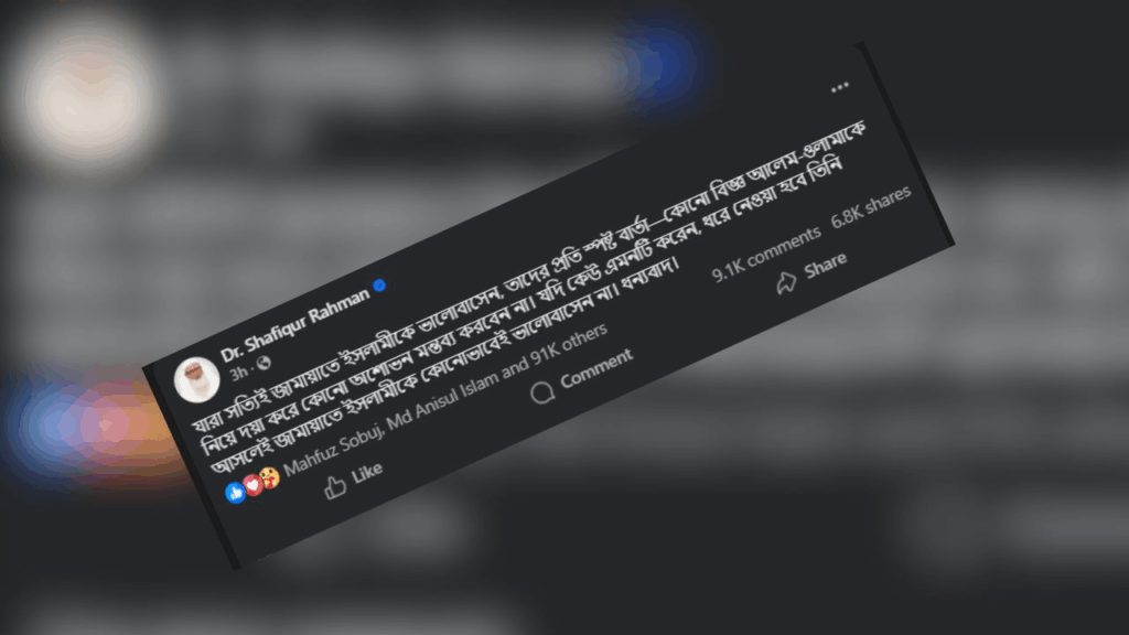 তিনি লিখেছেন, “যারা সত্যিই জামায়াতে ইসলামীকে ভালোবাসেন, তাদের জন্য স্পষ্ট বার্তা—কোনো বিজ্ঞ আলেম-ওলামাকে নিয়ে দয়া করে কোনো অশোভন মন্তব্য করবেন না।”