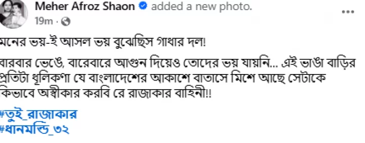 পোস্টে তিনি উল্লেখ করেন, “মনের ভয়-ই আসল ভয় বুঝেছিস গাধার দল! বারবার ভেঙে, বারেবারে আগুন দিয়েও তোদের ভয় যায়নি… এই ভাঙা বাড়ির প্রতিটা ধূলিকণা যে বাংলাদেশের আকাশে বাতাসে মিশে আছে সেটাকে কিভাবে অস্বীকার করবি রে রাজাকার বাহিনী!!”