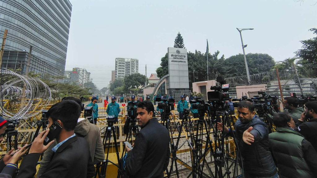 সরেজমিনে দেখা গেছে, পুরো হাসপাতাল এলাকাকে ঘিরে কঠোর নিরাপত্তা বলয় তৈরি করা হয়েছে। সেখানে বিজিবি ও পুলিশের বিপুলসংখ্যক সদস্য মোতায়েন রয়েছে। সড়ক ফাঁকা রাখতে হাসপাতালের সামনের অংশ থেকে লোকজনকে নিরাপদ দূরত্বে সরিয়ে দেওয়া হচ্ছে।