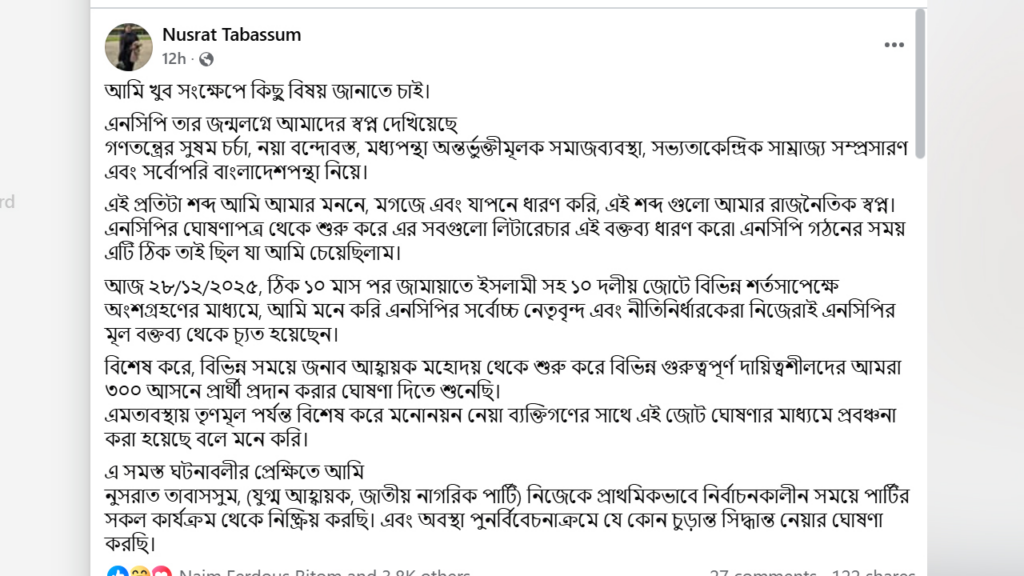 জাতীয় নাগরিক পার্টির (এনসিপি) যুগ্ম আহ্বায়ক নুসরাত তাবাসসুম ঘোষণা দিয়েছেন, নির্বাচনকালীন সময়ে তিনি দলটির সব কার্যক্রম থেকে নিজেকে সাময়িকভাবে নিষ্ক্রিয় রাখছেন।